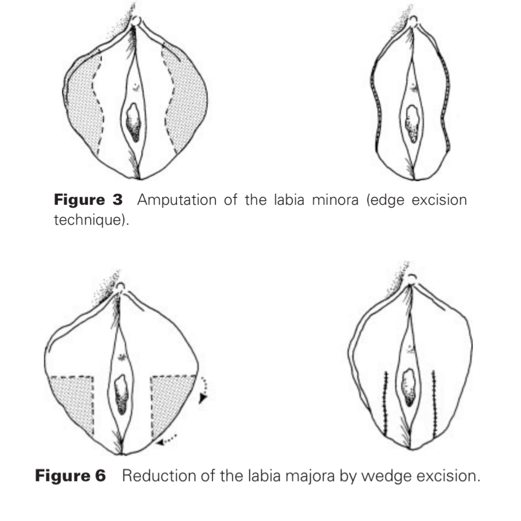 Labios menores: la labioplastía se enfoca en reducir el tamaño de los labios menores al retirar el exceso de tejido que protruye a través de los labios mayores. Suele realizarse en forma longitudinal (a lo largo) o retirando una cuña en forma de V.